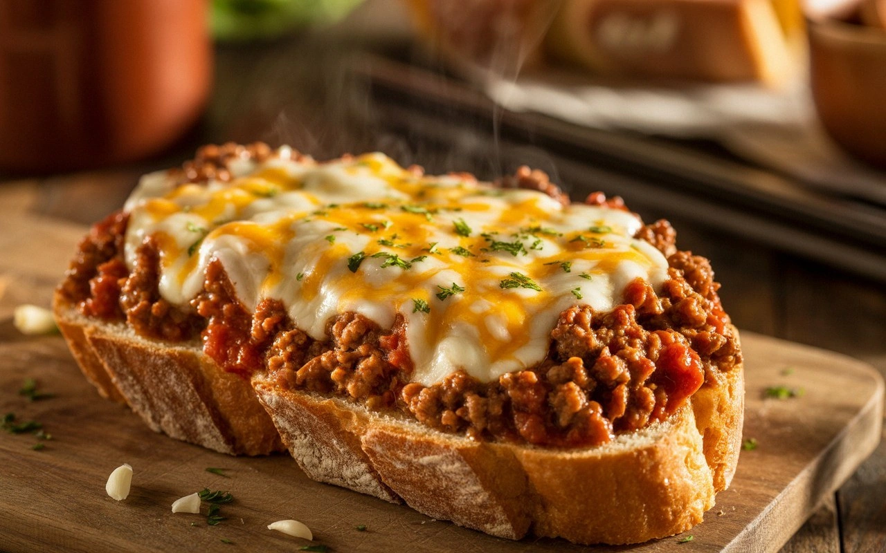 The first bite is a symphony of textures: the bread is buttery and slightly crispy, the meat sauce is velvety thick, and the melted cheeses cascade like a molten waterfall. The aroma is a heady mix of caramelized onions, garlic, and a hint of tangy ketchup, while the sound of the sizzling skillet is music to any kitchen enthusiast’s ears. The taste is a bold, savory explosion—sweet, tangy, and peppery—all wrapped in a gooey blanket of mozzarella and cheddar. Feel the heat from the oven radiating through the kitchen, the steam curling up in lazy ribbons that promise a comforting meal. This recipe isn’t just another garlic bread; it’s a culinary adventure that will have your family begging for more.